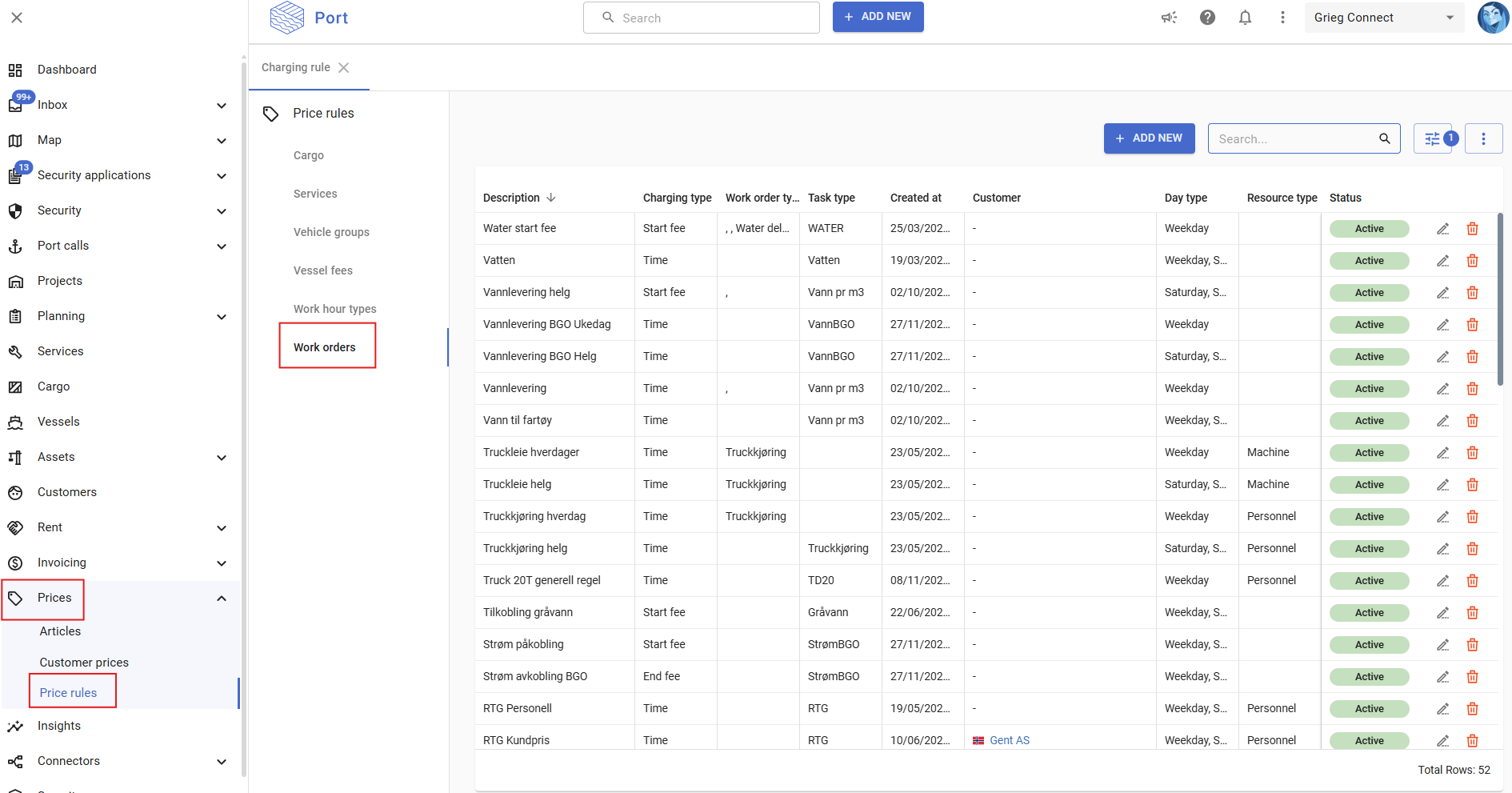 The charging rules module for work orders has been moved to Prices → Standard prices → Work orders, so all price rules are now gathered in one place.