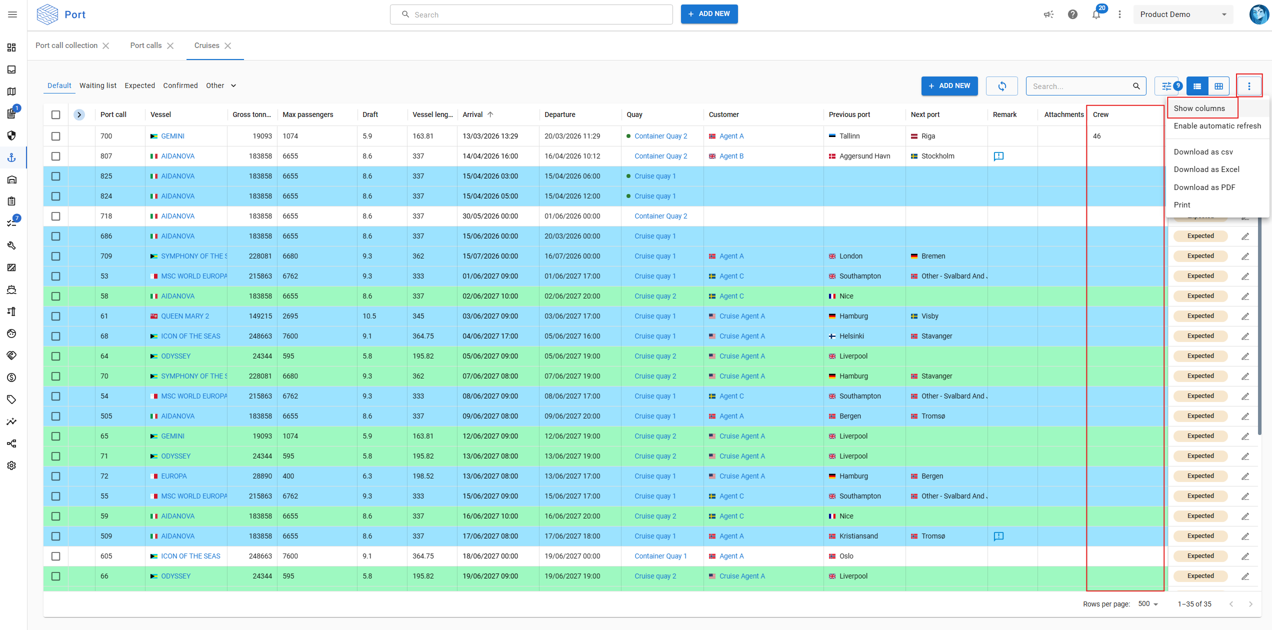 Det er nå mulig å vise en valgfri kolonne for antall mannskap i anløpslister og cruiselister.