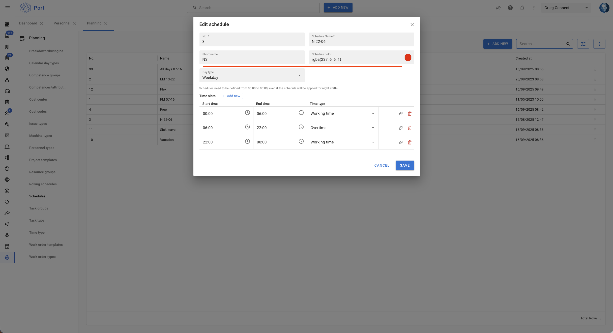 Visualization and color coding are controlled by the schedule assigned to each person (short name and color code)